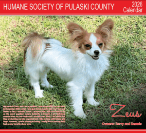 We are pleased to bring you our seventh HSPC wall calendar! All photos are entrants in our Adorable Arkansas Pets Photo Contest, which we ran earlier in 2025. You will get to know some amazing animals, many of whom are rescues. This beautiful calendar measures 11″ w x 10″ h (11″ w x 20″ h when open).